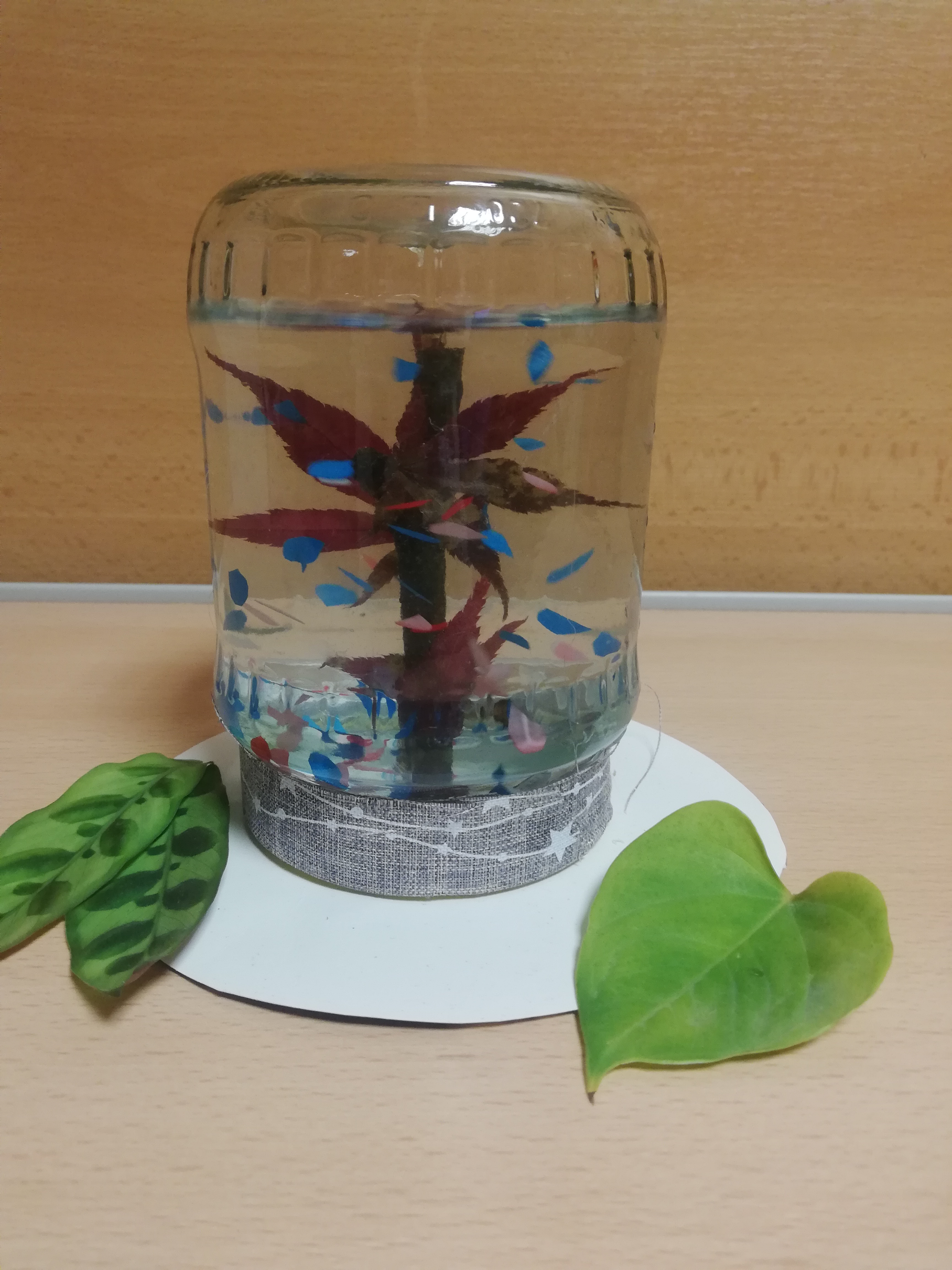 Při výrobě byla použita zavařovací sklenice, kterou si klienti sami vyzkoušeli očistit houbičkou a dolít čistou vodou. Dále větvička s listy, které si tavnou pistolí přilepili k sobě, kterou zároveň upevnili na spodní stranu víčka dané sklenice. Z barevného papíru, který si sami klienti vybrali, nastříhali opět za dopomoci asistentů malá kolečka, která se vložila do sklenice s vodou a do dokončení zbývalo jen zavřít sklenici s víčkem. 🍃