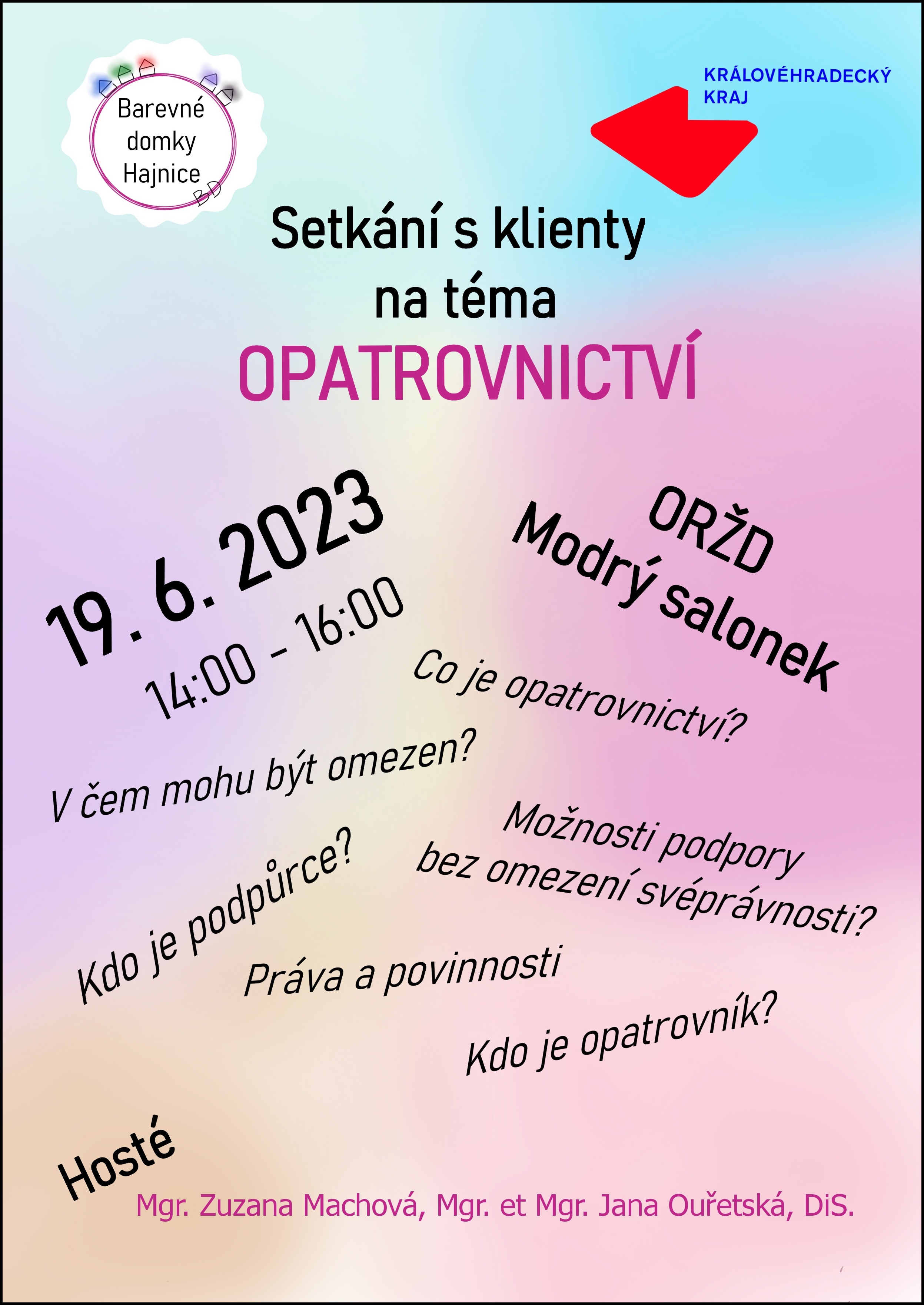V pondělí 19. 6. se v prostorách Oranžového domu v Trutnově uskutečnilo setkání s klienty na téma OPATROVNICTVÍ. Poutavou a srozumitelnou formou byla pro klienty Barevných domků Hajnice připravena prezentace na dané téma od krajské metodičky a sociální pracovnice Mgr. Zuzany Machové.