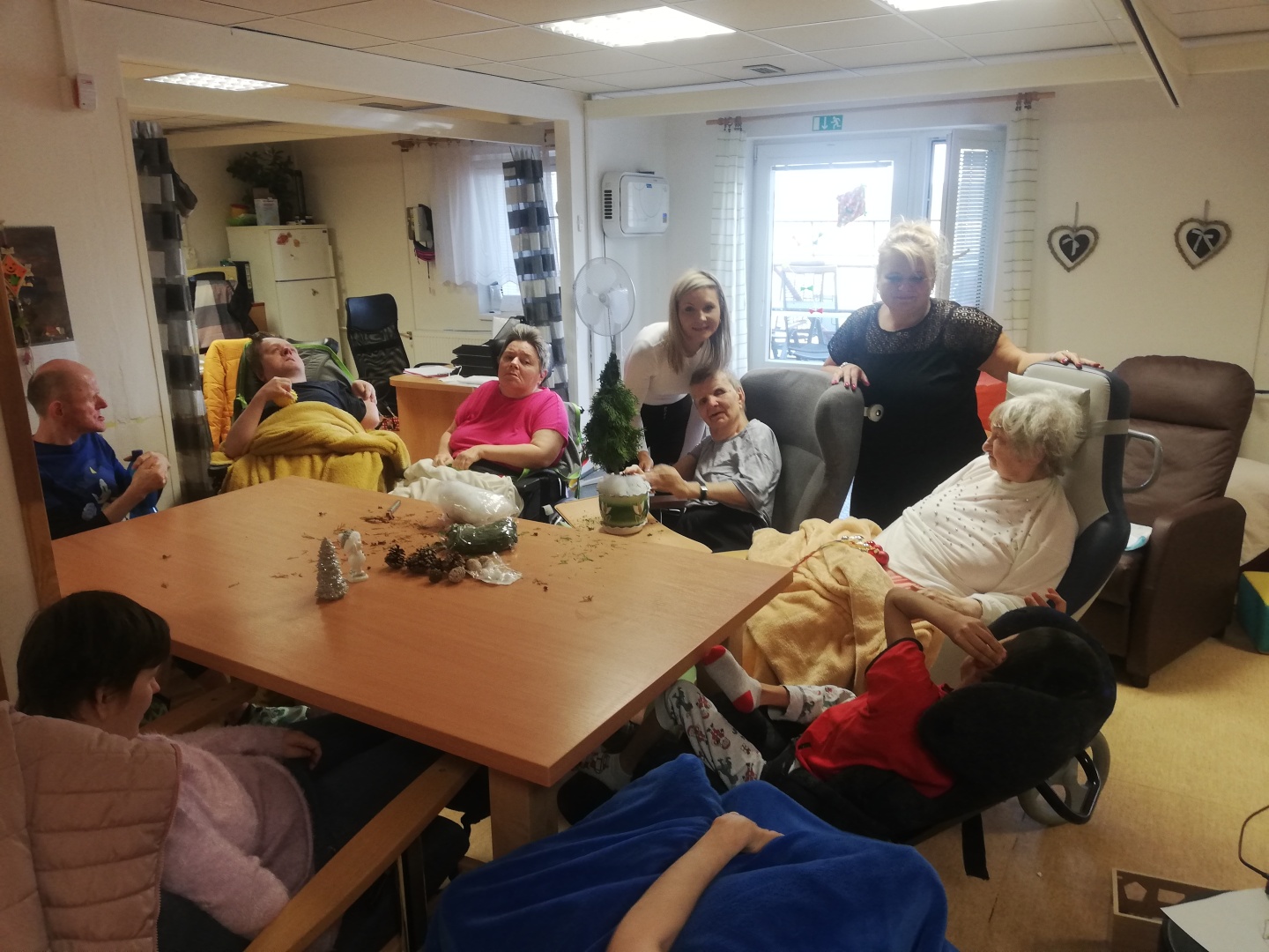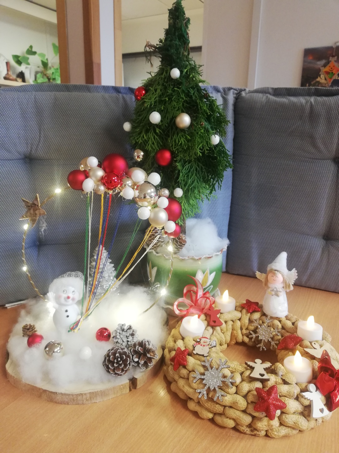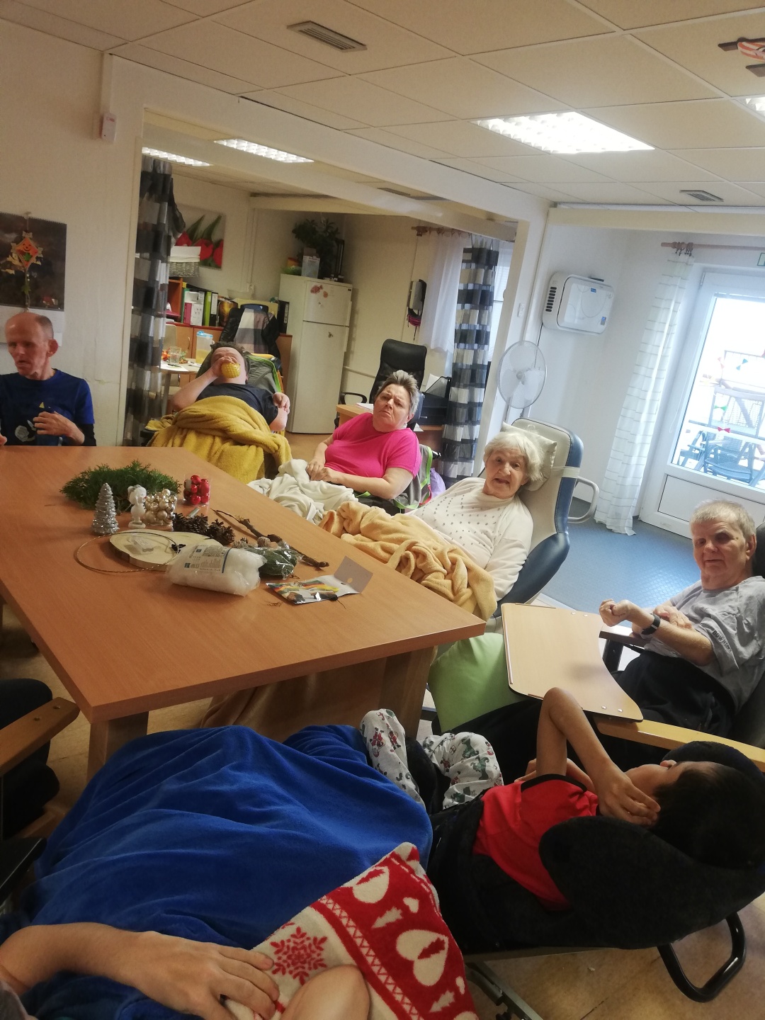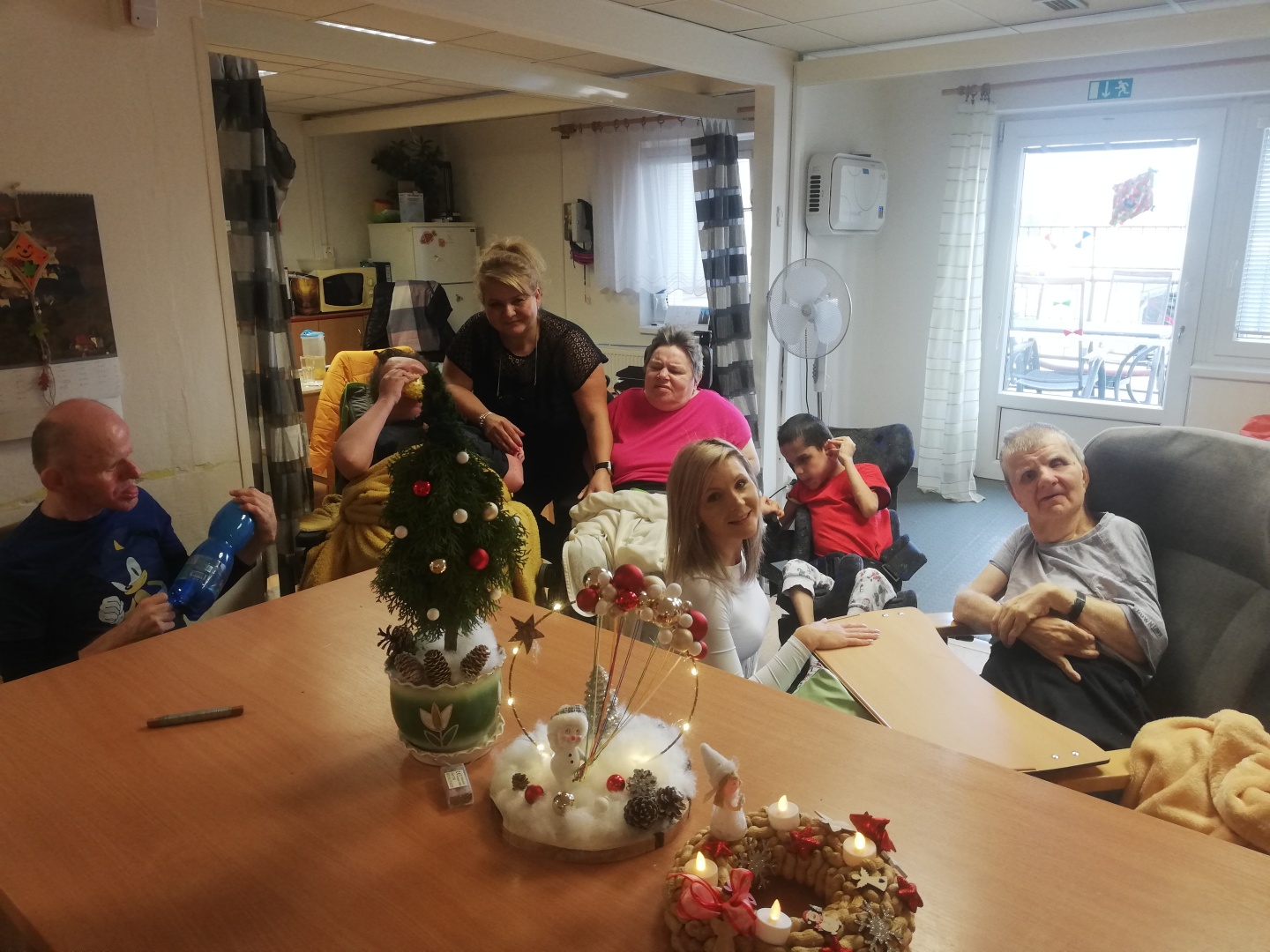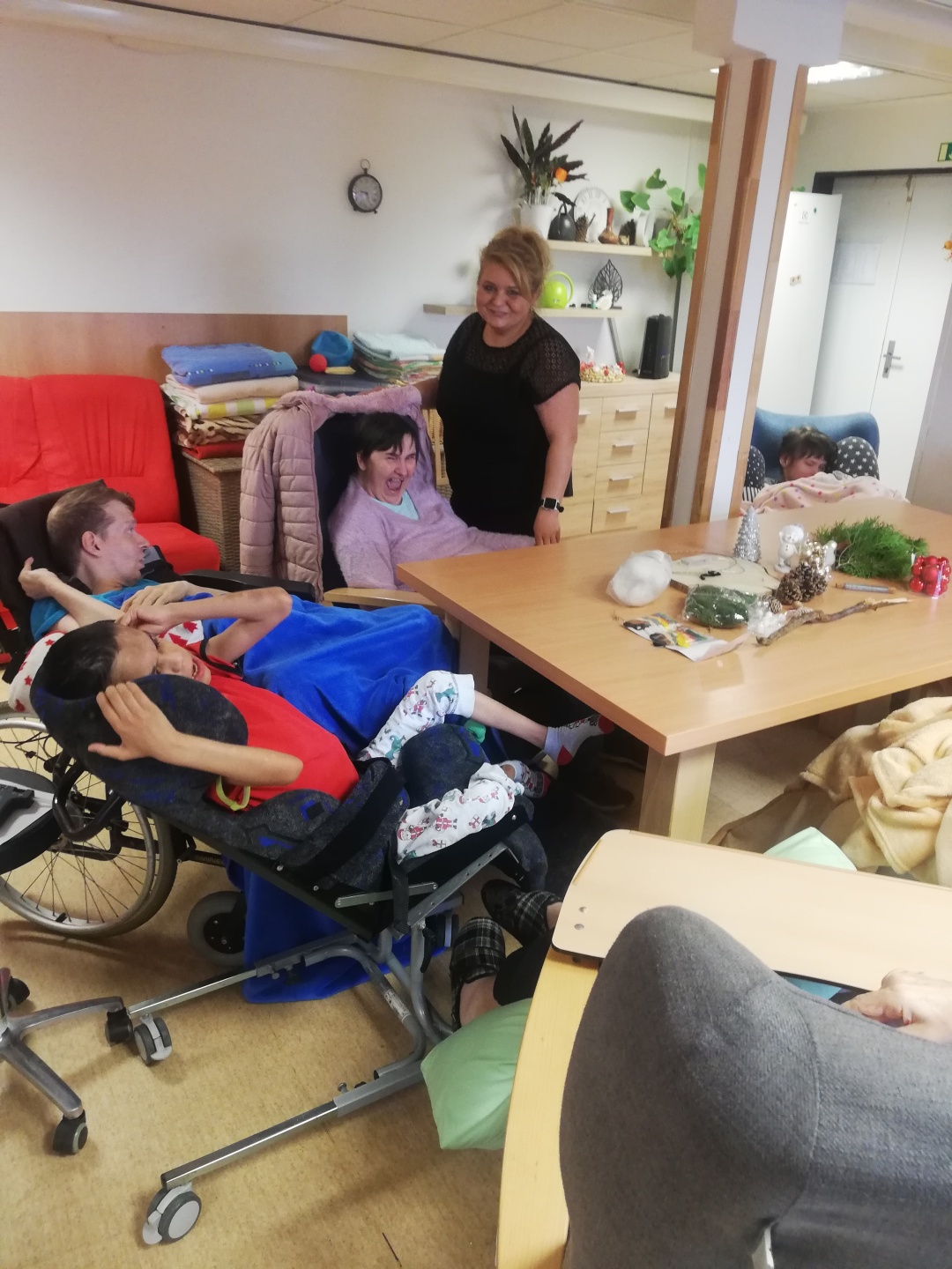 Na Slunečném oddělení začala příprava vánoční výzdoby. 🎀 Během přípravy a dokončování různých dekorací si klienti poslechli tradiční vánoční koledy a výklad, co k Vánocům patří – vánoční tradice. Klienti během tvorby trénovali jemnou motoriku a vše měli možnost poznávat zrakem, sluchem a hmatem. K dekorováni využili předměty jako jsou dřevěné kulativy, šišky, smrkové větvičky, vata, keramické dekorativní předměty, světýlka, barevné stužky. Za dopomoci asistentů si klienti vyzkoušeli práci s tavnou pistolí, stříhání nůžkami, lepení lepidlem. ✂️