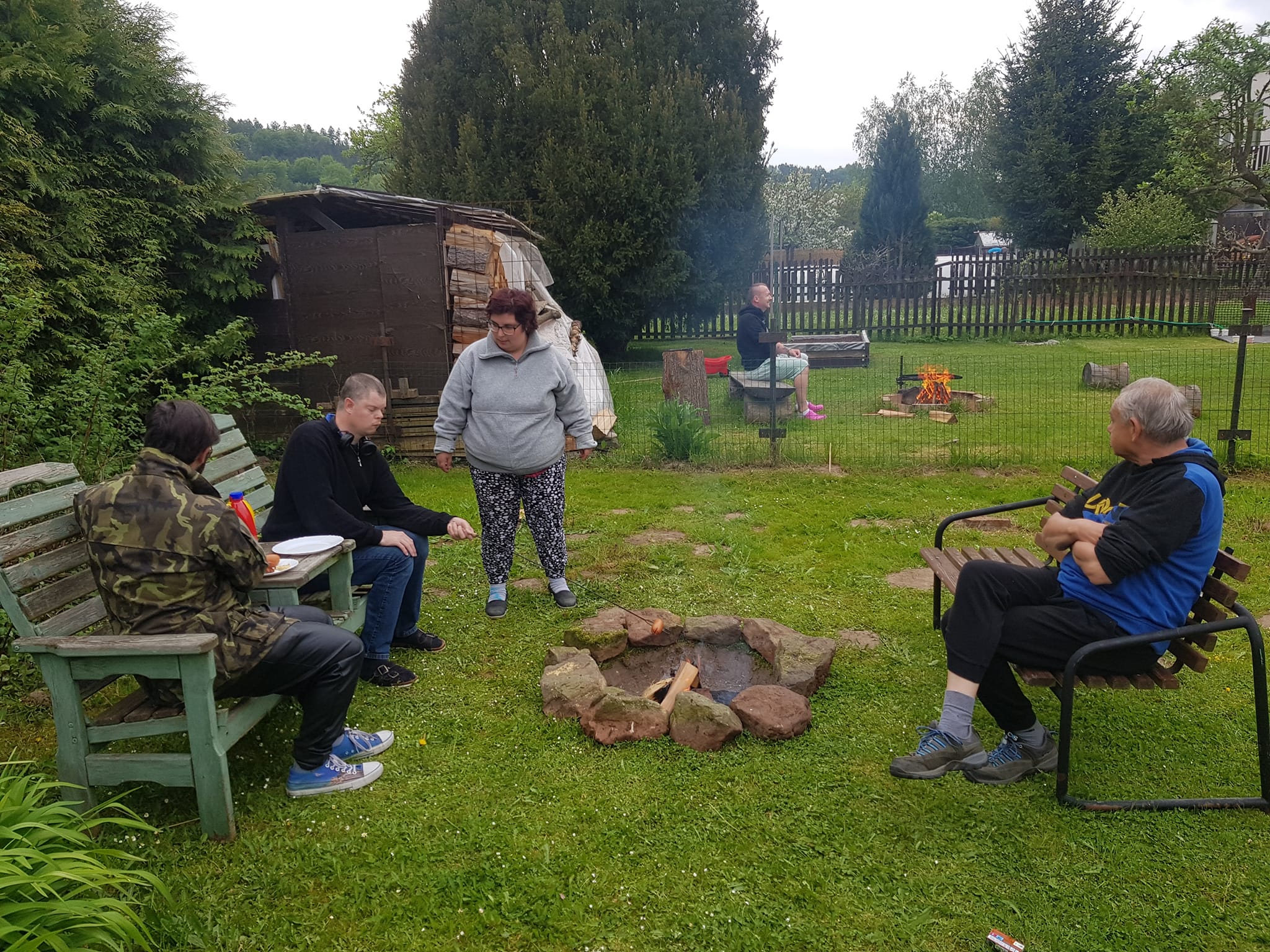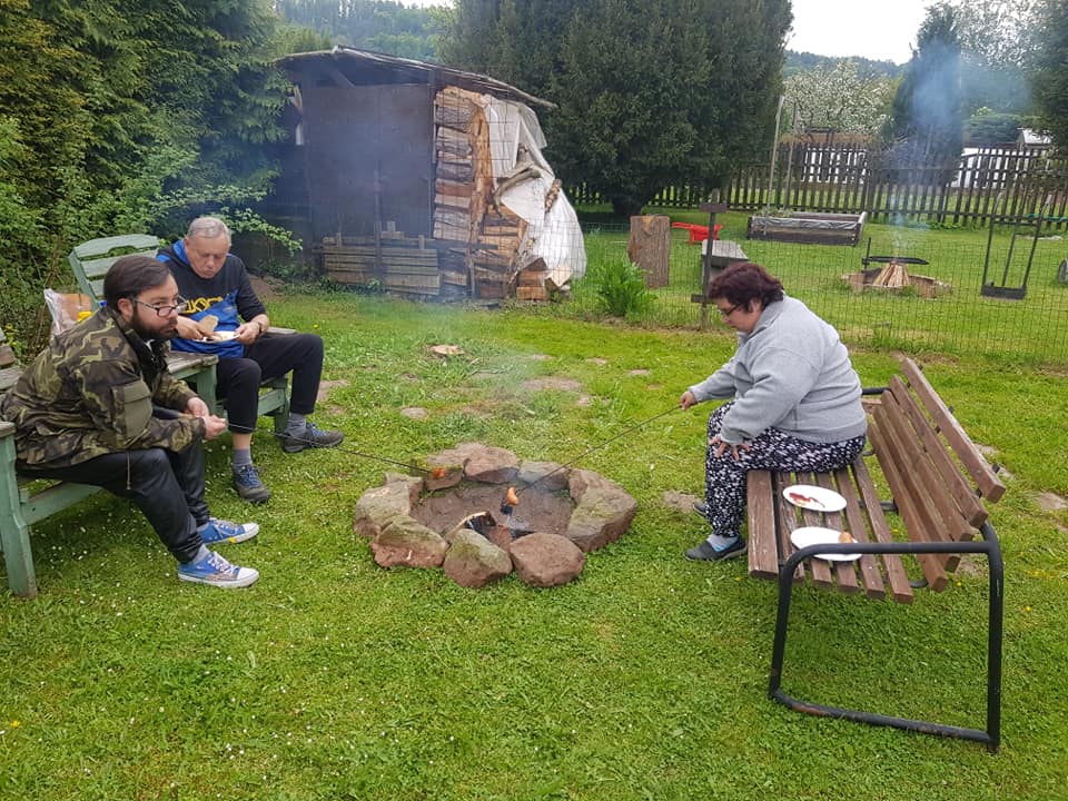 No a na závěr nemohlo chybět občerstvení v parku. 🥖☕ Po návratu jsme ještě pokřtili naše nové ohniště, ani nás neodradilo, že dřevo z pokácených stromů moc nehořelo. 😁🪵 Na opečení prvních buřtů to stačilo. 👍🏼