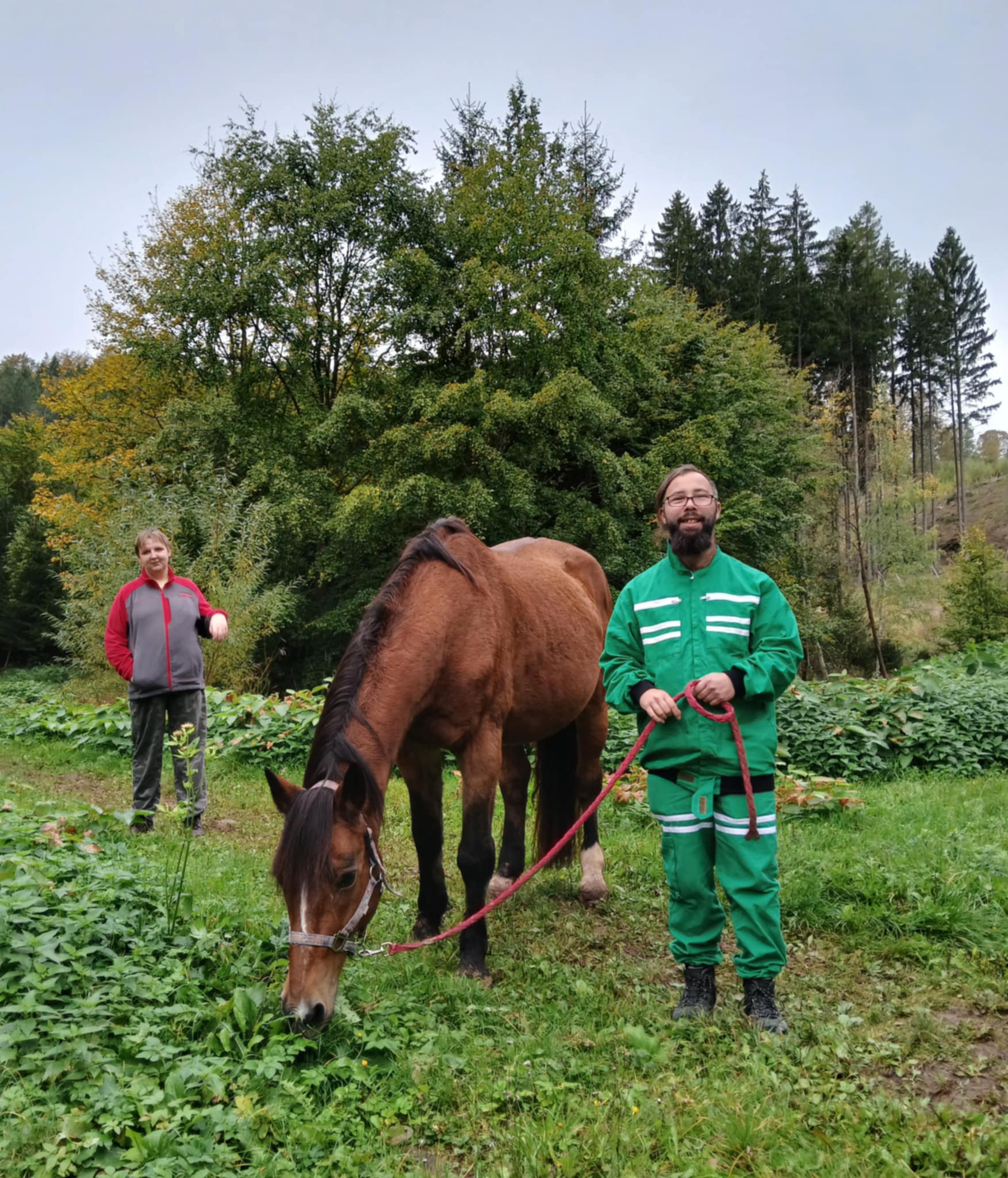 Návštěva u koní na Pecce se i přes mírnou nepřízeň počasí povedla. Klienti Pavel a Petr z domácností Chráněné bydlení v DKnL si před procházkou koně Matesa vyčistili a rozčesali 🐴 ...tento koňský důchodce (23 let), na kterém se už nejezdi, ocenil procházku spojenou s pastvou. 🤩🐎