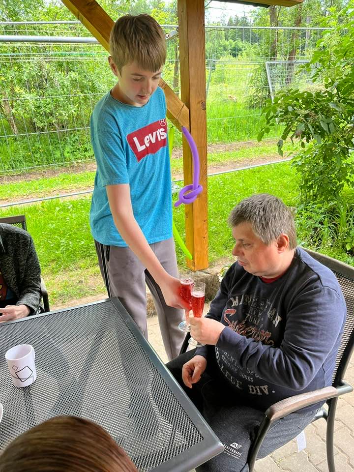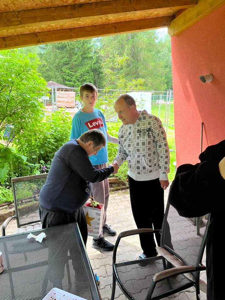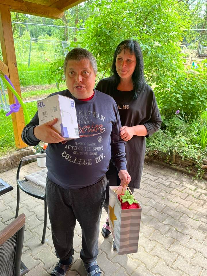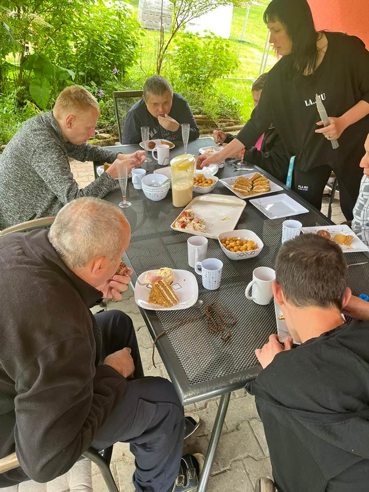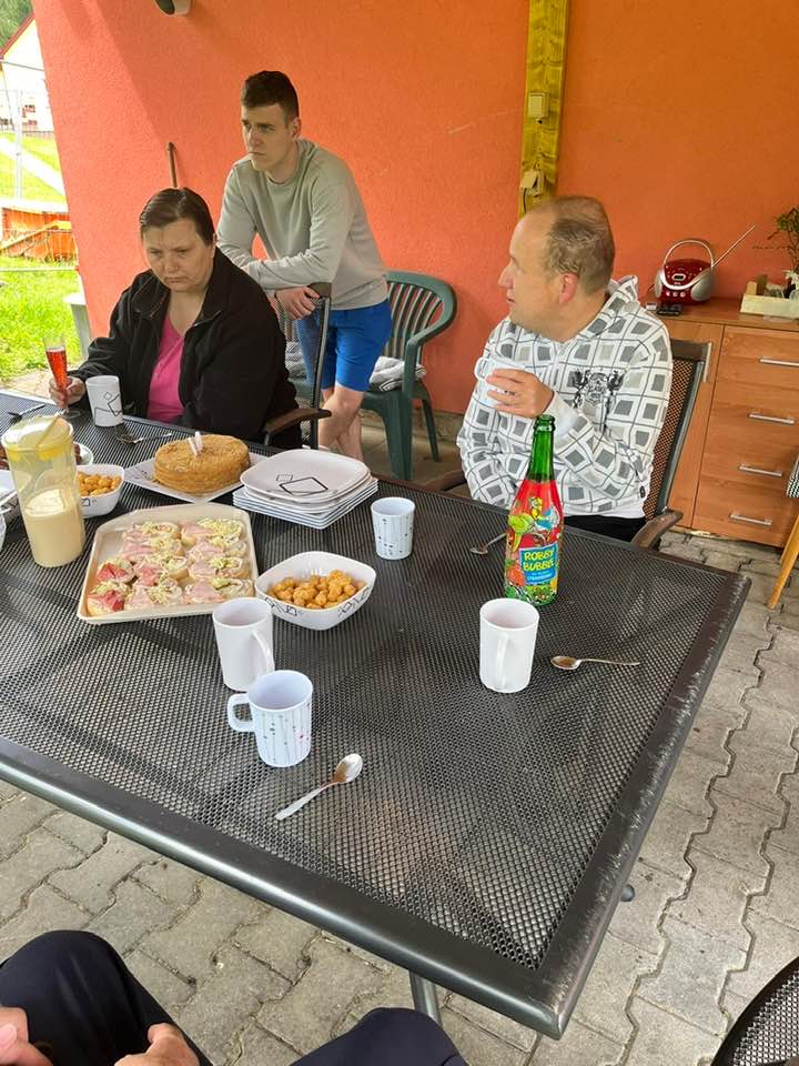 Pan Tomáš oslavil své narozeniny v kruhu svých spolubydlících z Červeného domku i klientů ze Žlutého domku. Nechybělo bohaté občerstvení, narozeninová výzdoba a samozřejmostí byl vynikající dort. 🎈🎁 Počasí bylo naprosto ukázkové, a tak se celá oslava mohla konat venku. 😎☀️