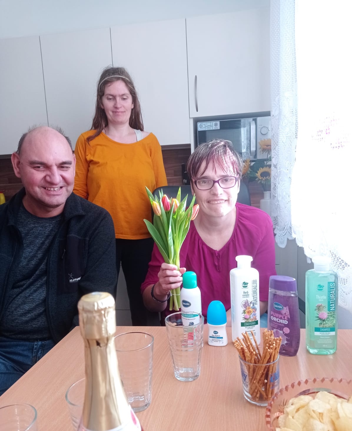 Věk neuvádíme, jak se u žen sluší a patří. 😇 Pozvání přijali klienti Oranžového, Šedého bytu a též klienti Duhových bytů. Slečnu Janu obdarovali sladkostmi a malými drobnostmi 🎁 .. za to se jim všem dostalo bohatého a chutného občerstvení, na kterém se pochopitelně slečna Jana velkou měrou podílela. 🤩