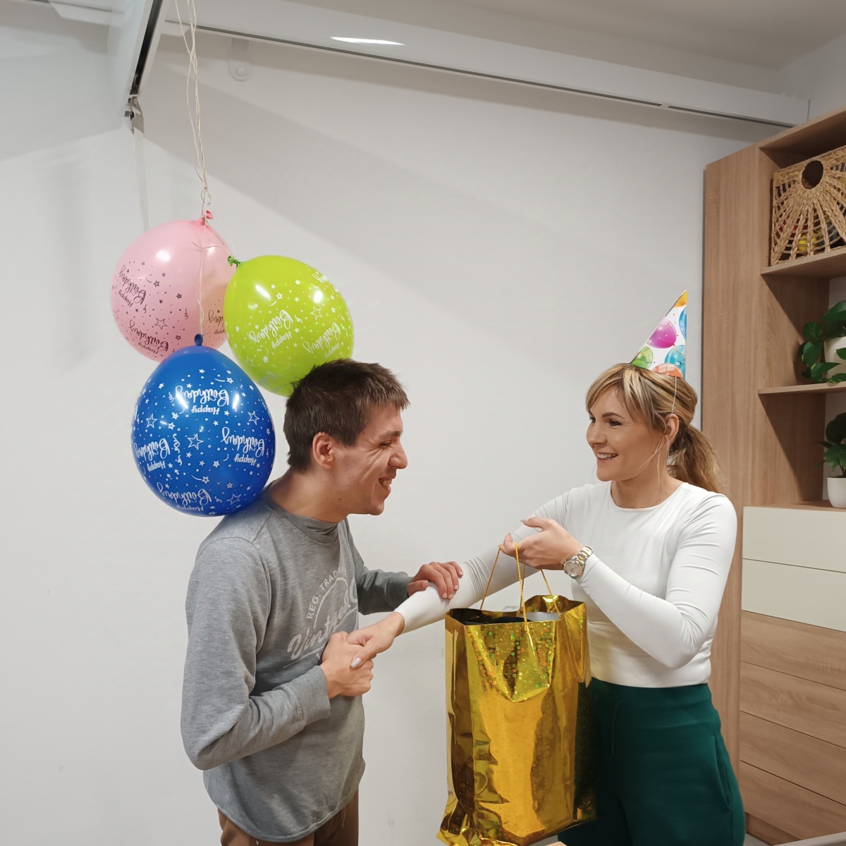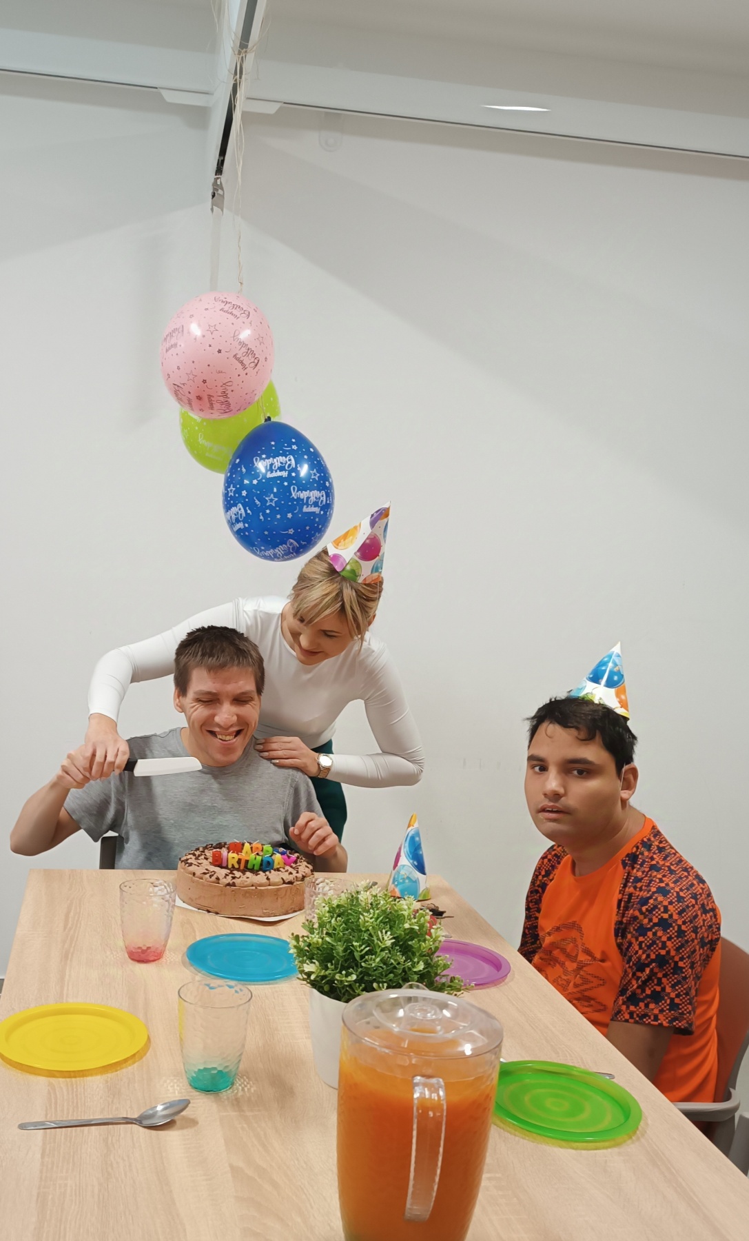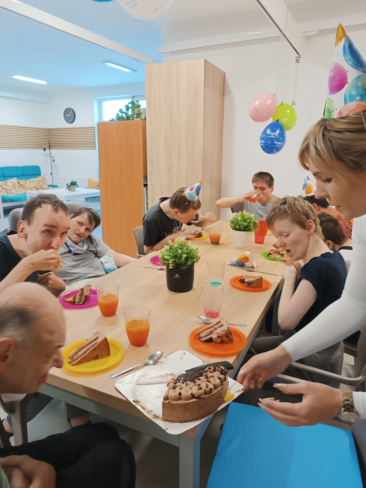 Pan Martin oslavil své 36. narozeniny, a to společně s ostatními uživateli a asistenty. 🥳 Veselou a příjemnou atmosféru zpříjemňoval především velký čokoládový dort, hudba, balónky různých barev a dárky, které panu Martinovi udělaly velikou radost. 🎂🎈 Oslavu jsme si všichni užili na maximum. 🎶🥂