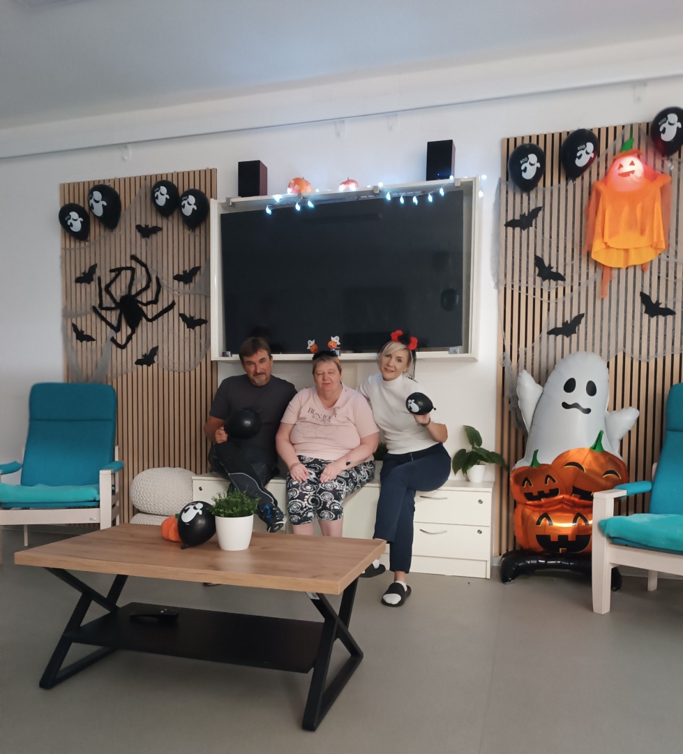 Klienti z Měsíčního bytu se aktivně podíleli na přeměně obývacího pokoje a venkovní terasy ve stylu halloweenu. 👻🎃 Jejich účast zahrnovala jak sledování celého tvůrčího procesu, tak i přímou pomoc s instalací. 🦇 Společně se s pracovníky pustili do výzdoby obývacího pokoje a venkovní terasy v strašidelném halloweenském duchu. 🕯️ Pomáhali rozmístit balónky, natáhnout umělé pavučiny a zavěsit drobné dekorace, to vše dodalo celému prostoru temnou a tajemnou atmosféru. 👻🎃