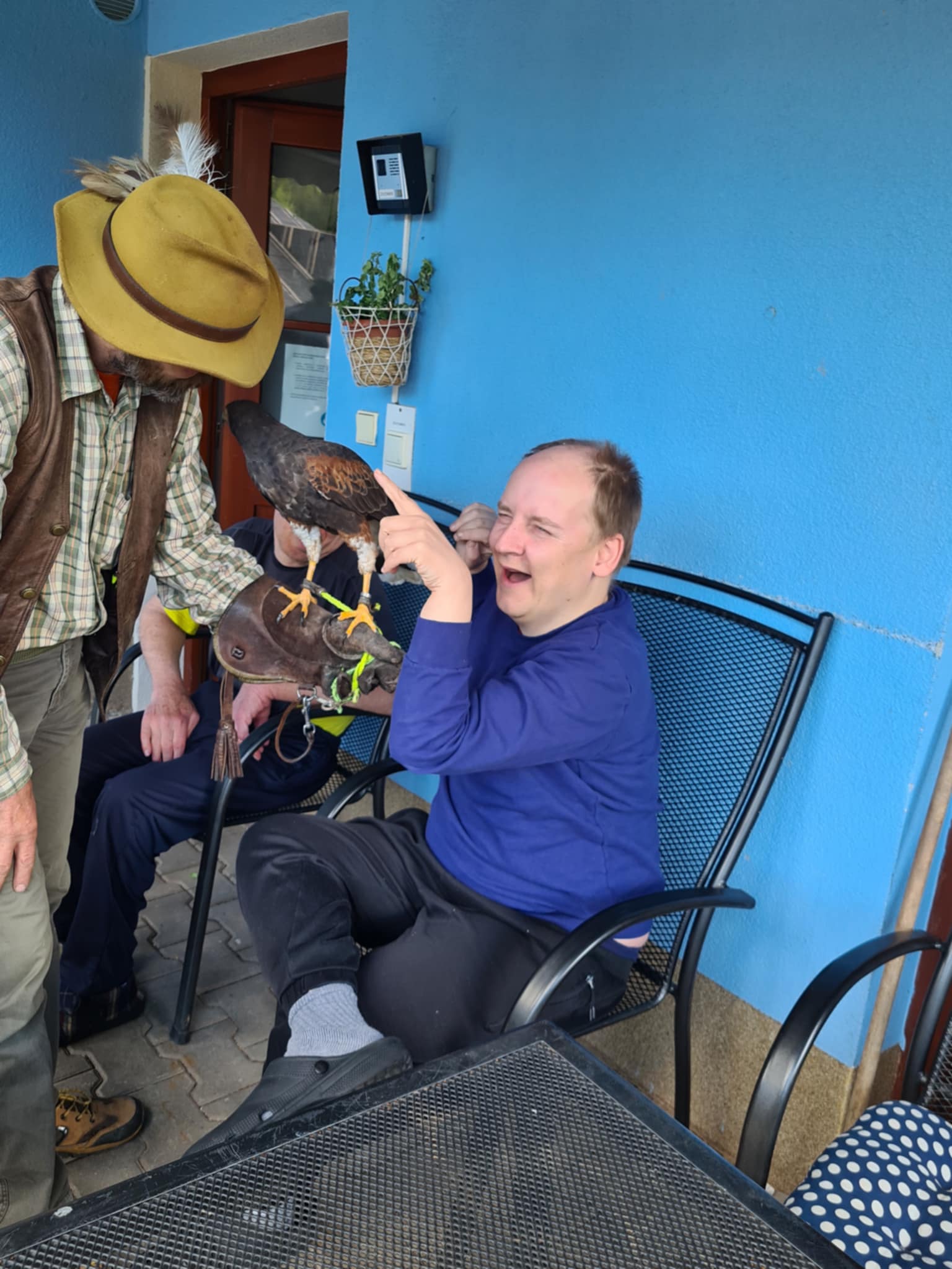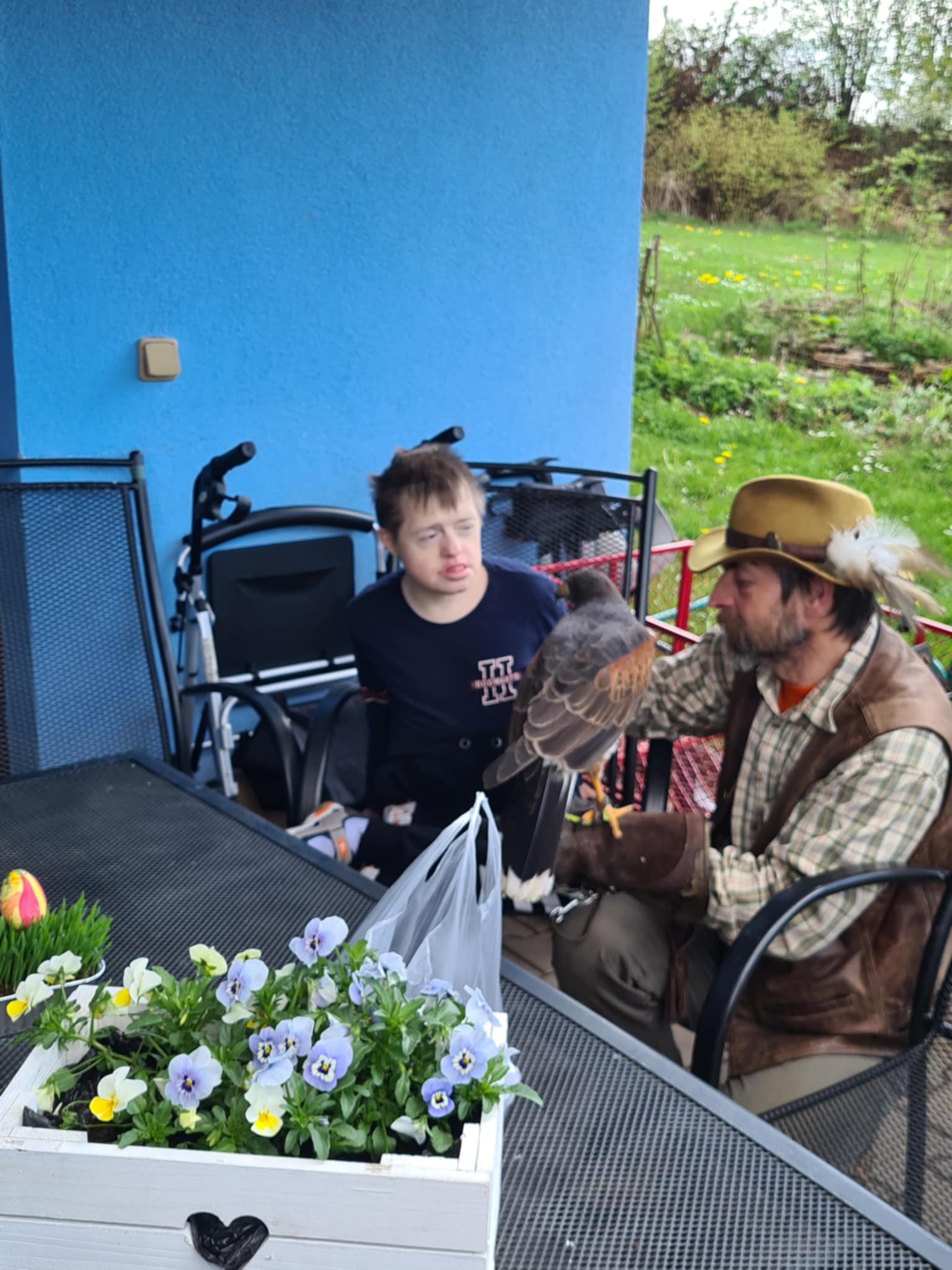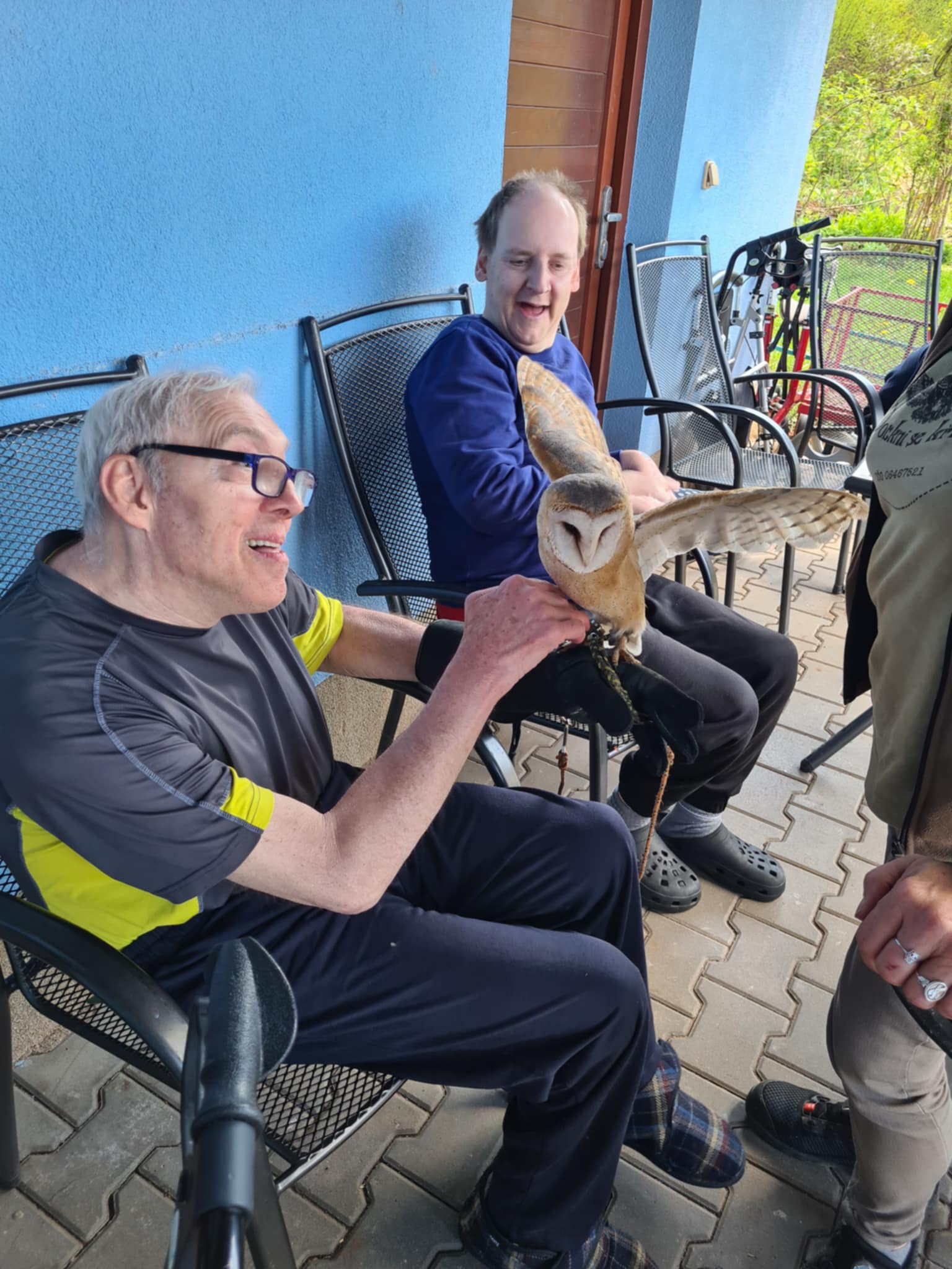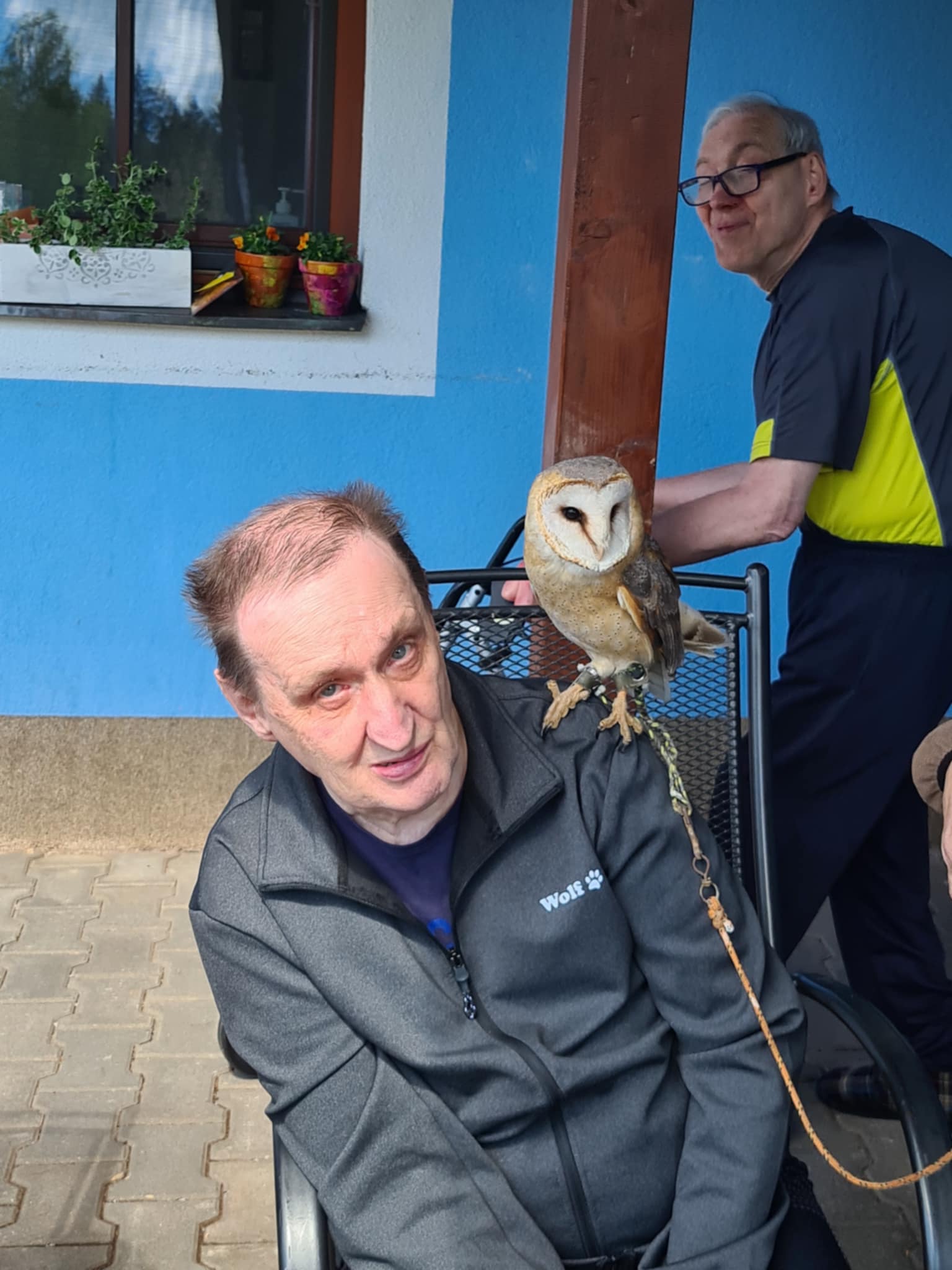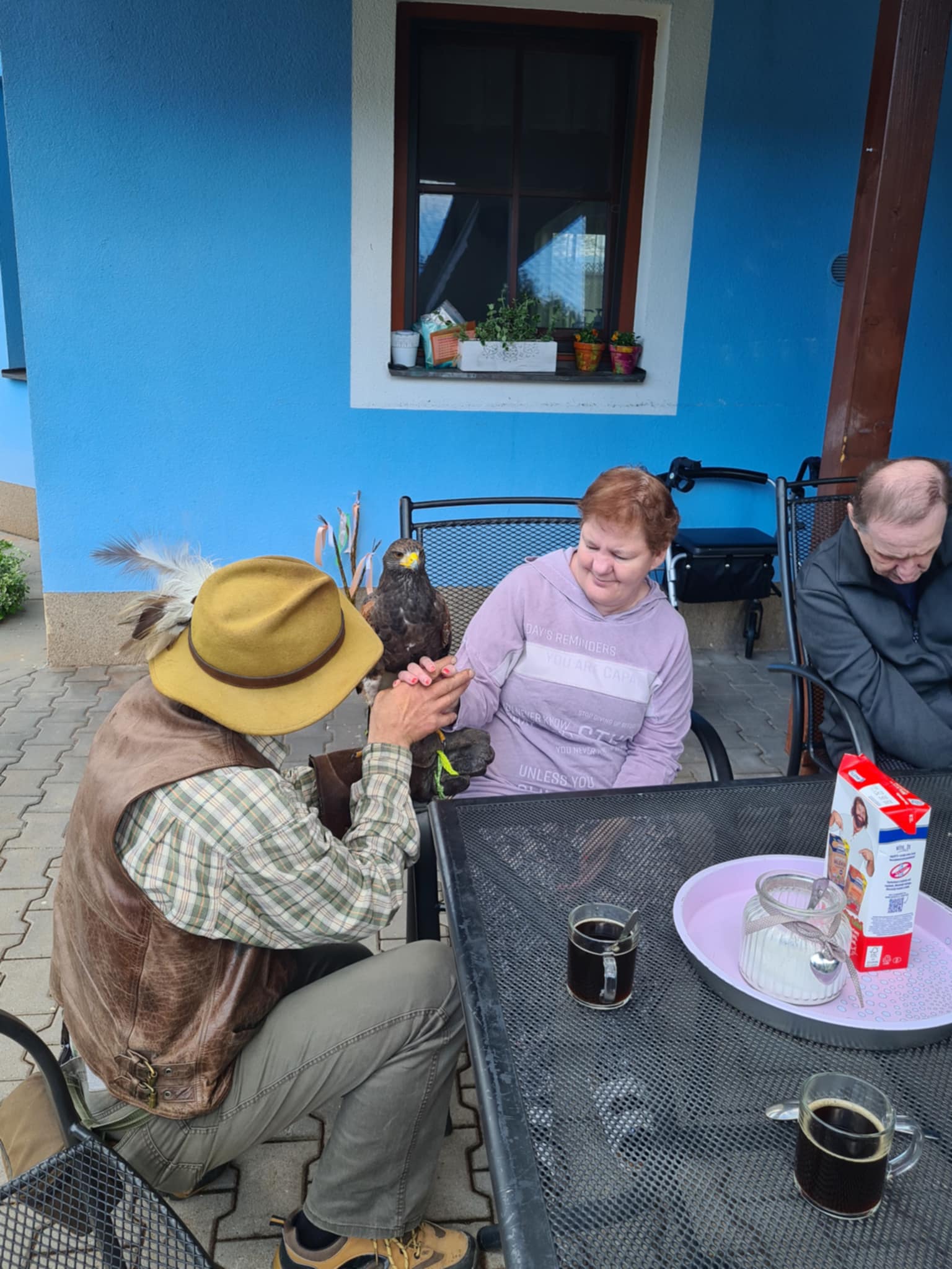 V Hajnici nás navštívili dravci. 🌞 Venku bylo slunečno, a tak jsme je přivítaly na terase domku. 🏡 Klienti byli zprvu nedůvěřiví, ale to po chvilce pominulo. 🤗🦅 Zážitek z přímého kontaktu s dravci a sovami byl nezapomenutelný. 🦅🦉