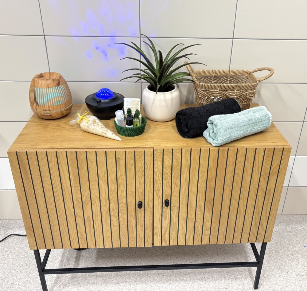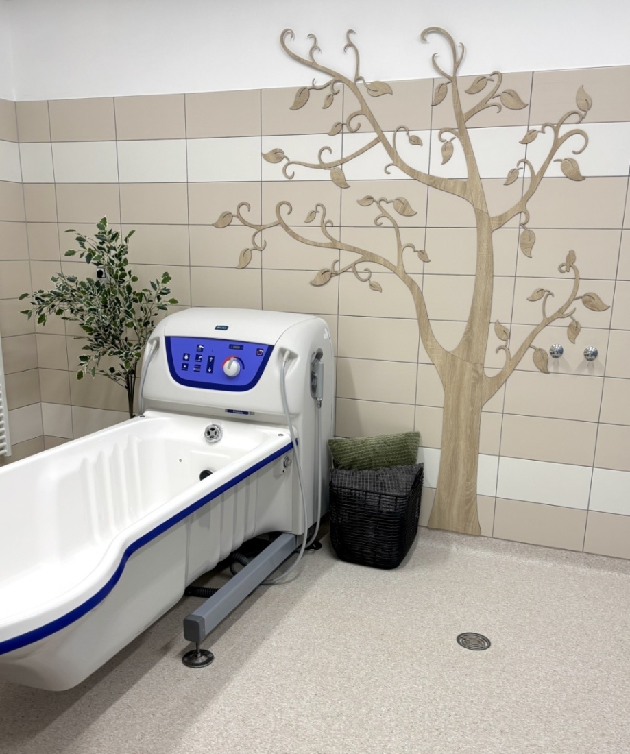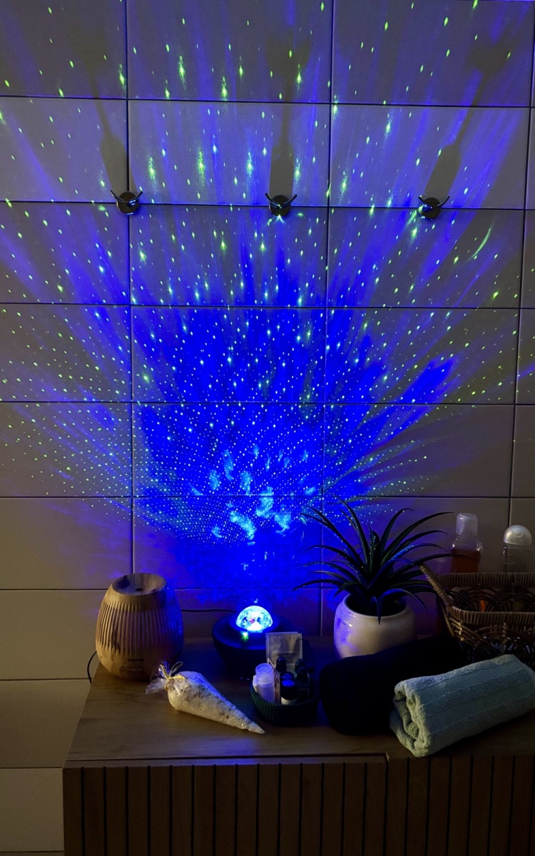 Tato koupelna je ideálním místem pro naše klienty, kde si dopřávají relaxační perličkové koupele, využívají aromaterapii pro lepší uvolnění. Pro ještě větší zážitek používáme projekci hvězdné oblohy, která klientům poskytuje pocit pohody a klidu. 😊