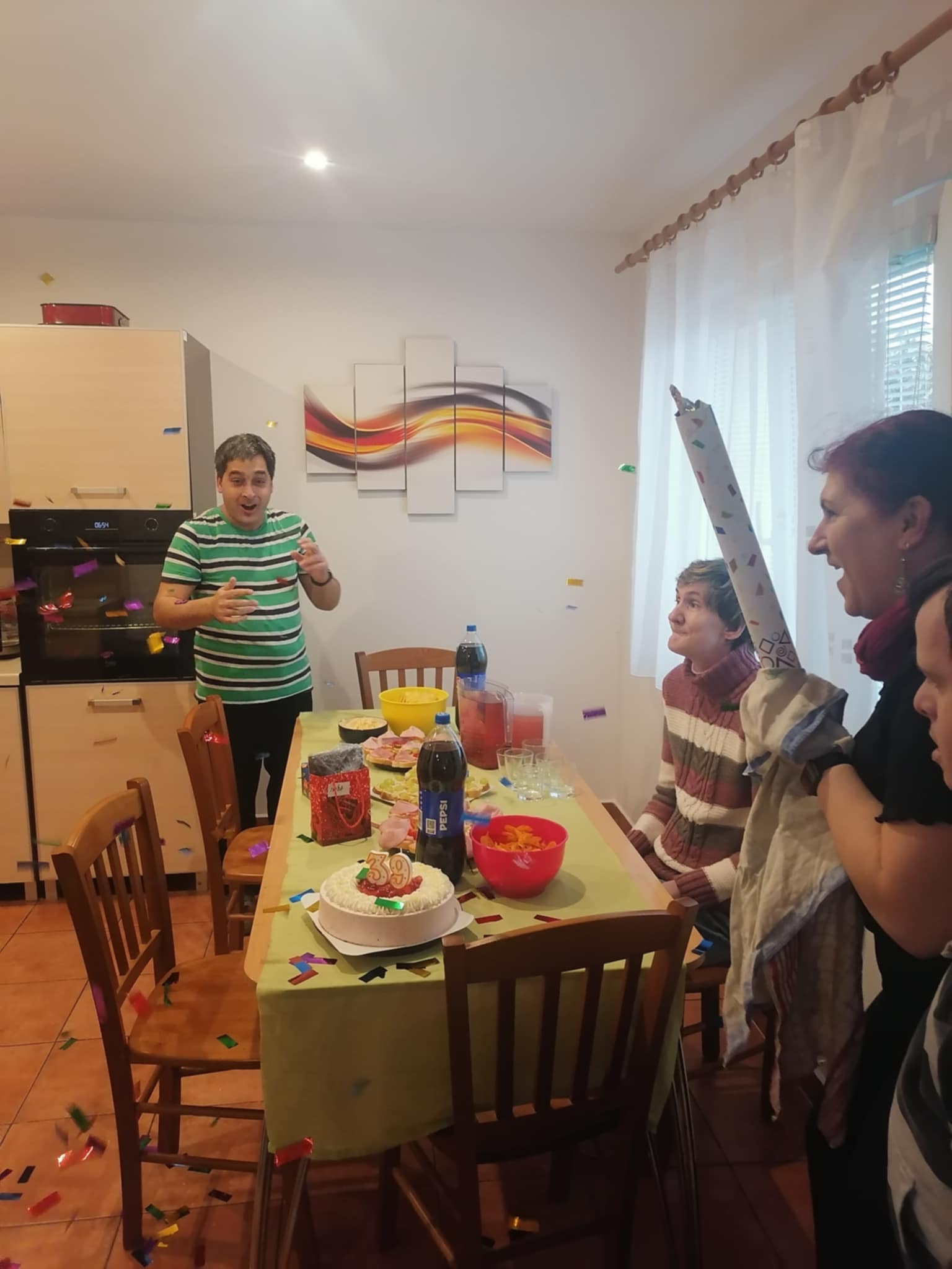 Pan Marian na oslavě svých 39. narozenin přivítal nejen své spolubydlící ze Zlatého domu, ale i opatrovnici. Všichni společně si užili slavnostní odpoledne. 🥳🎈 A pokud by vás zajímalo, kdo připravil pro oslavence takový krásný dort, tak to byla právě paní opatrovnice. Nejen že skvěle vypadal, ale i výborně chutnal. 🎂
