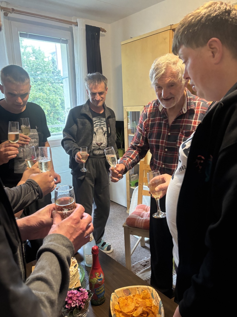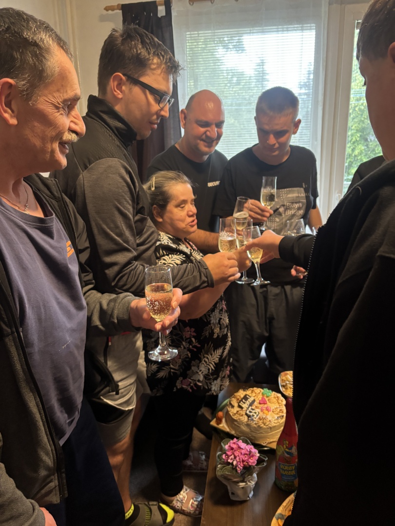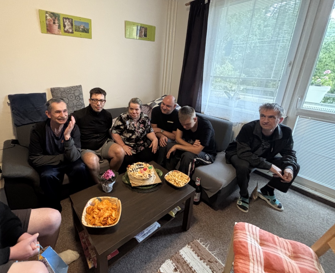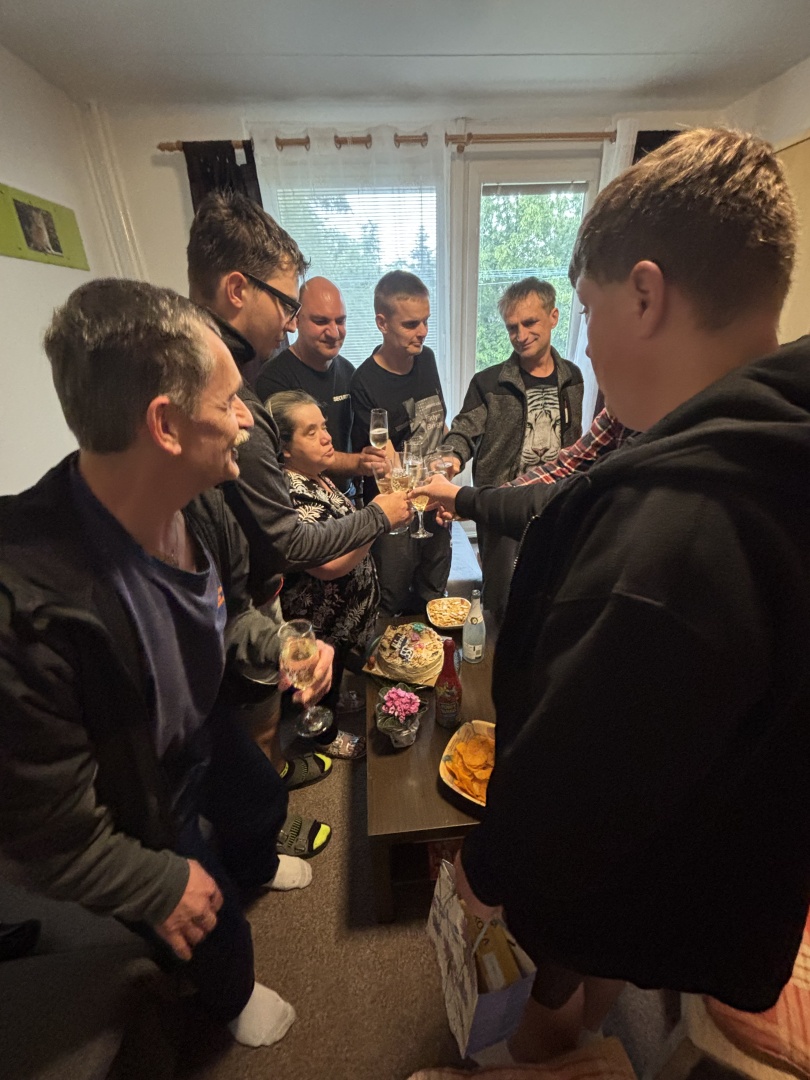 Paní Helena oslavila v červenci své 55. narozeniny. 🎂 Oslavy se zúčastnili přátelé z Azurového, Tyrkysového i Oranžového bytu. 🥳 Společně strávili příjemné odpoledne, popovídali si, dali si drobné občerstvení a především popřáli oslavenkyni. 🥂👩🏼